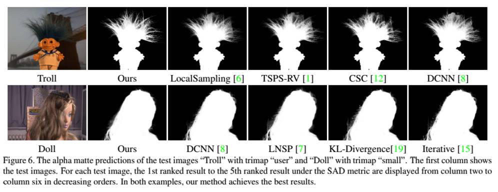图 6:α蒙版预测使用「user」三分图的「Troll」和「small」三分图的「Doll」作为测试图像。第一列显示了测试图像。对于每一张测试图像,按照降序从第 2 列到第 6 列显示了 SAD 度量(SAD metric)下的排名结果(排名 1 到 5)。在这两个例子中,我们的方法都实现了最好的结果。