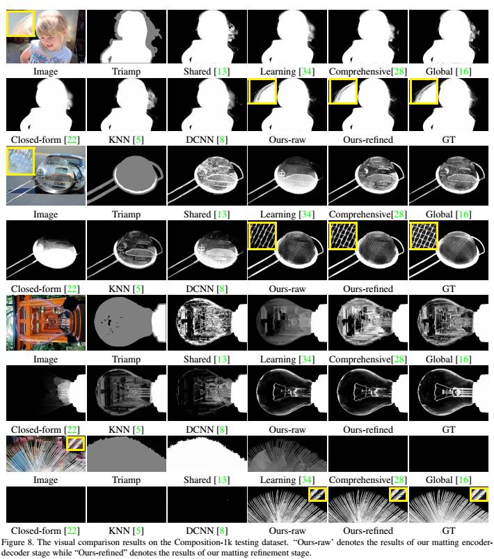 精炼图像的效果在图 4 中展示了。注意,该精炼网络并没有大规模改变α蒙版,只不过是精炼并锐化α值。