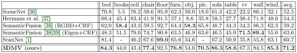 表6 我们通过将预测的3D标签投影到相应的RGB-D帧来评估我们的方法在2D语义分割任务上的性能。这里,我们对在NYU2上的密集像素分类精度进行了比较。注意,表中ScanNet分类是11类分类任务的精度统计结果。