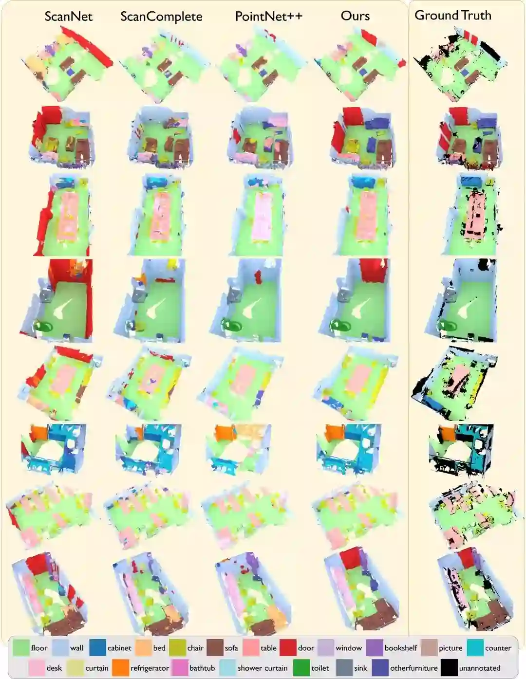 图3 在ScanNet测试集上的定性语义分割结果。我们对比了基于3D的ScanNet、ScanComplete、PointNet+++的方法。注意,参考标准场景中包含一些未标注区域,用黑色表示。我们的联合3D多视图方法实现更准确的语义预测。