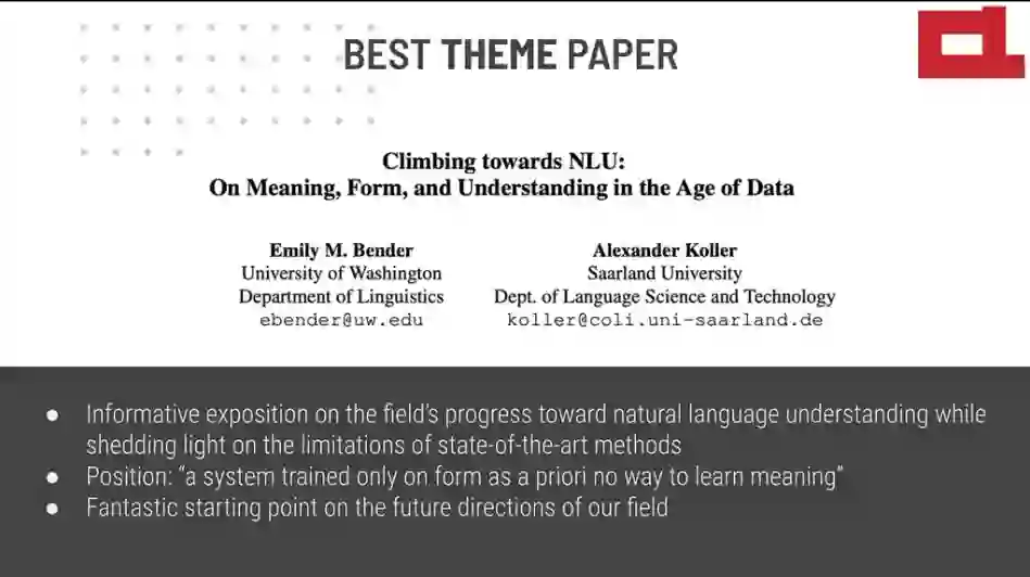 本文主要着重分析今年的 Best Theme Paper,文章题目为 Climbing towards NLU: On Meaning, Form, and Understanding in the Age of Data(迈向 NLU:关于数据时代的意义、形式和理解),文章的作者是来自华盛顿大学的 Emily M. Bender 及萨尔兰大学的 Alexander Koller。