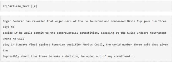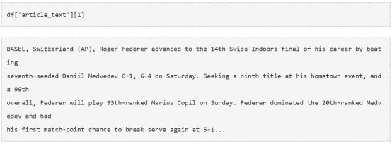 数据集有三列,分别是‘article_id’,‘article_text’,和‘source’。我们对‘article_text’列的内容最感兴趣,因为它包含了文章的文本内容。让我们打印一些这个列里的变量的值,具体看看它们是什么样。
