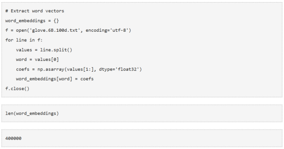 GloVe词向量是单词的向量表示。这些词向量将用于生成表示句子的特征向量。我们也可以使用Bag-of-Words或TF-IDF方法来为句子生成特征,但这些方法忽略了单词的顺序,并且通常这些特征的数量非常大。