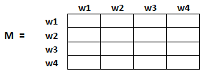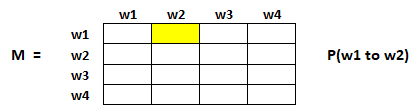 矩阵中得每个元素表示从一个页面链接进另一个页面的可能性。比如,如下高亮的方格包含的是从w1跳转到w2的概率。