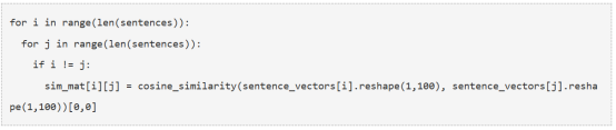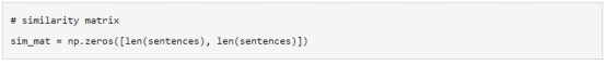 首先定义一个n乘n的零矩阵,然后用句子间的余弦相似度填充矩阵,这里n是句子的总数。
