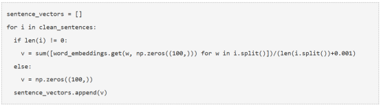 现在,来为我们的句子生成特征向量。我们首先获取每个句子的所有组成词的向量(从GloVe词向量文件中获取,每个向量大小为100个元素),然后取这些向量的平均值,得出这个句子的合并向量为这个句子的特征向量。