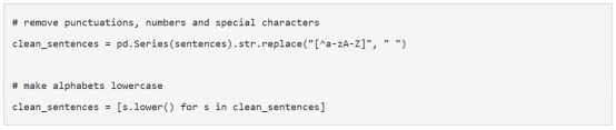 尽可能减少文本数据的噪声是一个好习惯,所以我们做一些基本的文本清洗(包括移除标点符号、数字、特殊字符,统一成小写字母)。