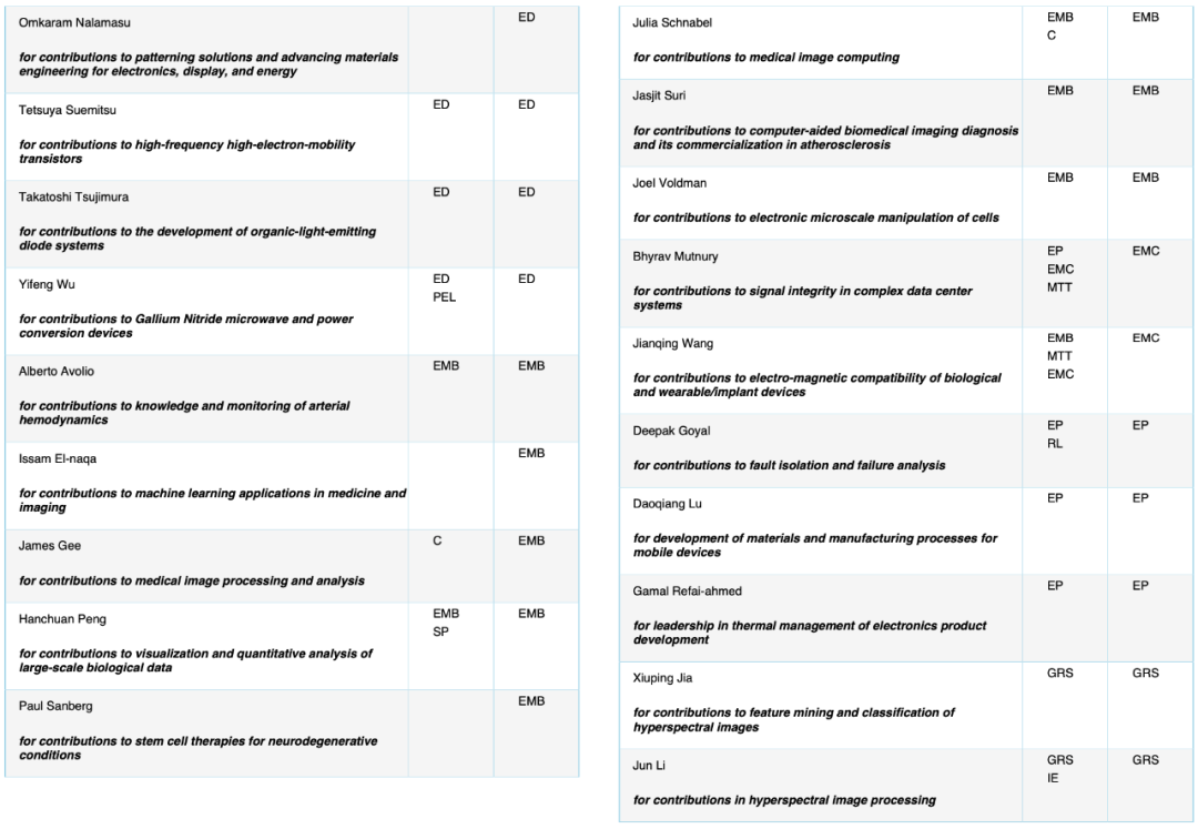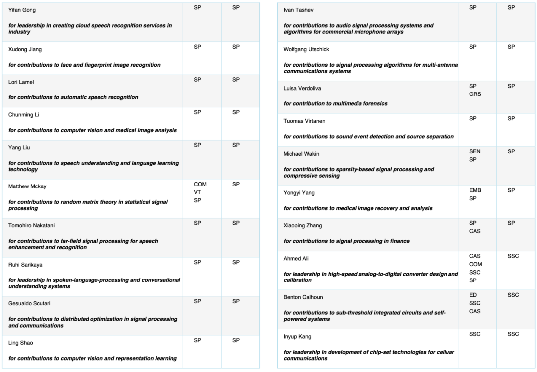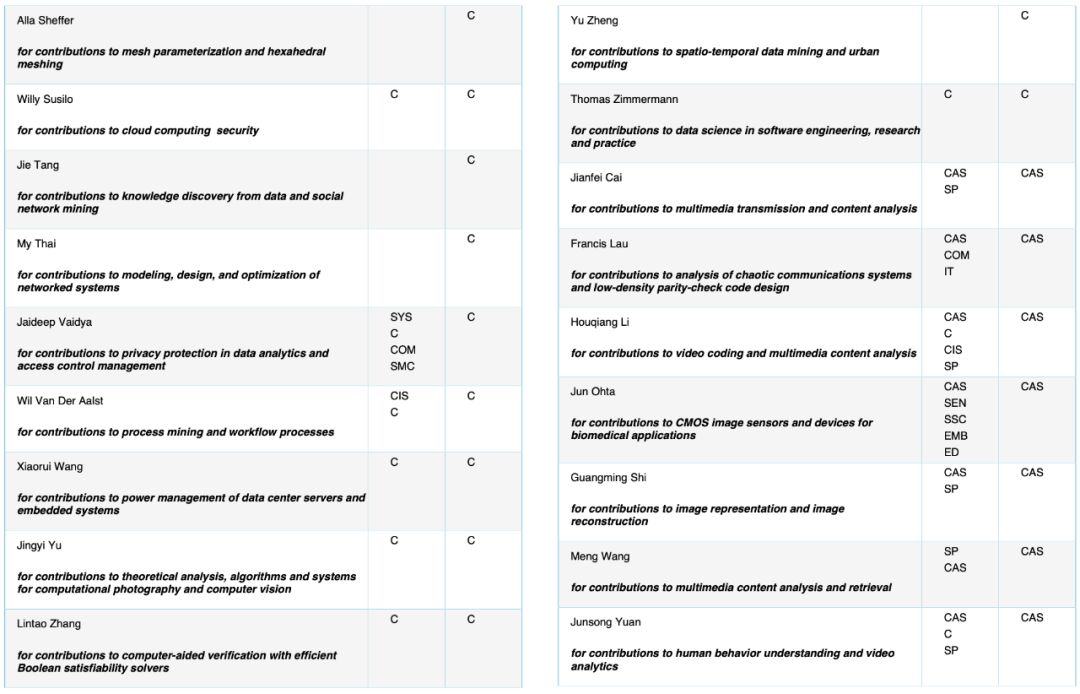 IEEE 的全称是 Institute of Electrical and Electronics Engineers(国际电气与电子工程师协会),是一个国际性电子技术与信息科学工程师的协会,如今在全球 160 多个国家和地区中拥有近 42 万会员。IEEE 建会于 1963 年 1 月 1 日,总部位于美国纽约市,是当今世界电子、电气、计算机、通信、自动化工程技术研究领域最著名、规模最大的非营利性跨国学术组织。在电气及电子工程、计算机及控制技术领域中,IEEE发表的文献占了全球将近 1/3。IEEE Fellow 即 IEEE 会士/院士,为协会最高等级会员,是该组织授予的最高荣誉,在学术科技界被认定为权威的荣誉和重要的职业成就,每年由同行专家在做出突出贡献的会员中评选出,当选人数不超过 IEEE 会员总人数的 0.1%。由于每年当选的 IEEE Fellow 数量较少,当选科学家基本都是在科学与工程技术领域内取得重要成就的杰出科学家。此次入选 IEEE Fellow 2021 名单的华人有:Jie Tang(唐杰)、Yi Huang(黄漪)、Guangming Shi(石光明)、Jingdong Chen(陈景东)、Hongke Zhang(张宏科)、Houqiang Li(李厚强)、Jianfei Cai(蔡剑飞)、Meng Wang(汪萌)、Jingyi Yu(虞晶怡)、Yu Zheng(郑宇)、Chunjiang Qian(钱春江)、Jiandong Li(李建东),Jun Li(李军),Xiuping Jia(贾秀萍),Huadong Ma(马华东),Huang De Shuang(黄德双)、Xiaofeng Liao(廖晓峰)、Bao-liang Lu(吕宝粮)、Jianhui Wang(王剑辉)、Junzhi Yu(喻俊志)、Dong Yue(岳东)、Shixia Liu(刘世霞)、Zhaocheng Wang(王昭诚)、Xiaoping Zhang(张晓平)、Wenchuan Wu(吴文传)、Zhongdong Wang(王忠东)、Jizhong Zhu(朱继忠)、Fushuan Wen(文福拴),Cong Wang(王聪)等。(学术头条注:由于 IEEE 历年新增 Fellow 名单只有英文名和入选原因,而没有详细的工作单位、职务和履历介绍,所以难免出现统计不全和错误,如有发现,欢迎补充指正。) 以下是学术头条(ID:SciTouTiao)统计的 75 位入选华人学者名单以及 IEEE 官方给出的入选理由,完整名单如下: 1、唐杰,清华大学计算机系教授、系副主任,获杰青、IEEE Fellow。研究人工智能、认知图谱、数据挖掘、社交网络和机器学习。发表论文300余篇,引用16000余次,获ACM SIGKDD Test-of-Time Award(十年最佳论文)。主持研发了研究者社会网络挖掘系统AMiner,吸引全球220个国家/地区2000多万用户。担任IEEE T. on Big Data、AI OPEN主编以及WWW’21、CIKM’16、WSDM’15的PC Chair。获北京市科技进步一等奖、人工智能学会一等奖、KDD杰出贡献奖。 入选理由:在从数据和社会网络挖掘中发现知识方向做出贡献(for contributions to knowledge discovery from data and social network mining)。2、黄漪(Yi Huang)入选理由:在硅整流二极管天线技术方向做出贡献(for contributions to rectenna technology)3、Hanyang Wang入选理由:在移动终端天线方向做出贡献(for contributions to mobile terminal antennas)4、Geyi Wen入选理由:在天线品质因数方向做出贡献(for contributions to antenna quality factor)5、Zhinong Ying入选理由:在移动终端天线技术方向做出贡献(for contributions to mobile terminal antenna technology)6、Ninghui Li入选理由:在数据隐私和安全方向做出贡献(for contributions to data privacy and security)7、刘世霞(Shixia Liu)入选理由:在可视化文本分析和可视化模型分析方向做出贡献(for contributions to visual text analysis and visual model analysis)8、Le Lu入选理由:在用于癌症检测和诊断的机器学习方向做出贡献(for contributions to machine learning for cancer detection and diagnosis)9、Xiaorui Wang入选理由:在数据中心服务器和嵌入式系统的电源管理方向做出贡献(for contributions to power management of data center servers and embedded systems)10、虞晶怡(Jingyi Yu)入选理由:在计算机摄影和计算机视觉的理论分析、算法和系统方向做出贡献(or contributions to theoretical analysis, algorithms and systems for computational photography and computer vision)11、Lintao Zhang入选理由:在具有高效布尔可满足性求解器的计算机辅助验证方向做出贡献(for contributions to computer-aided verification with efficient Boolean satisfiability solvers)12、郑宇(Yu Zheng)入选理由:在时空数据挖掘与城市计算方向做出贡献(for contributions to spatio-temporal data mining and urban computing)13、蔡剑飞(Jianfei Cai)入选理由:在多媒体传输与内容分析方向做出贡献(for contributions to multimedia transmission and content analysis)14、李厚强(Houqiang Li)入选理由:在视频编码和多媒体内容分析方向做出贡献(for contributions to video coding and multimedia content analysis)15、石光明(Guangming Shi)入选理由:在图像表示和图像重建方向做出贡献(for contributions to image representation and image reconstruction)16、汪萌(Meng Wang)入选理由:在多媒体内容分析与检索方向做出贡献(for contributions to multimedia content analysis and retrieval)17、Junsong Yuan入选理由:在人类行为理解和视频分析方向做出贡献(for contributions to human behavior understanding and video analytics)18、黄德双(Huang De Shuang)入选理由:在模式识别和生物信息学的神经网络方向做出贡献(for contributions to neural networks for pattern recognition and bioinformatics)19、廖晓峰(Xiaofeng Liao)入选理由:在神经动力学系统和混沌密码学方向做出贡献(for contributions to neurodynamic systems and chaotic cryptography)20、吕宝粮(Bao-liang Lu)入选理由:在人工神经网络和脑机接口方向做出贡献(for contributions to artificial neural networks and affective brain- computer interfaces)21、Min Chen入选理由:在数据驱动的通信、缓存和计算方向做出贡献(for contributions to data-driven communication, caching, and computin