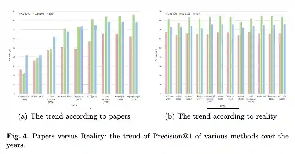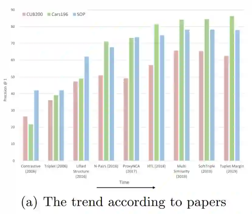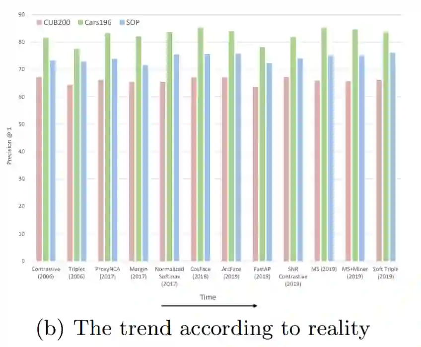 通过这些基线损失所呈现的良好实现、公平竞争环境和机器学习实践,研究者获得了如图 4(b) 所示的趋势图——事实上它似乎是平滑的走向。这表明无论是在 2006 年还是在 2019 年,各种方法的性能都是相似的。换句话说,度量学习算法并没有取得论文中所说的那么夸张的进展,论文中没有提到的前沿论文也值得怀疑。