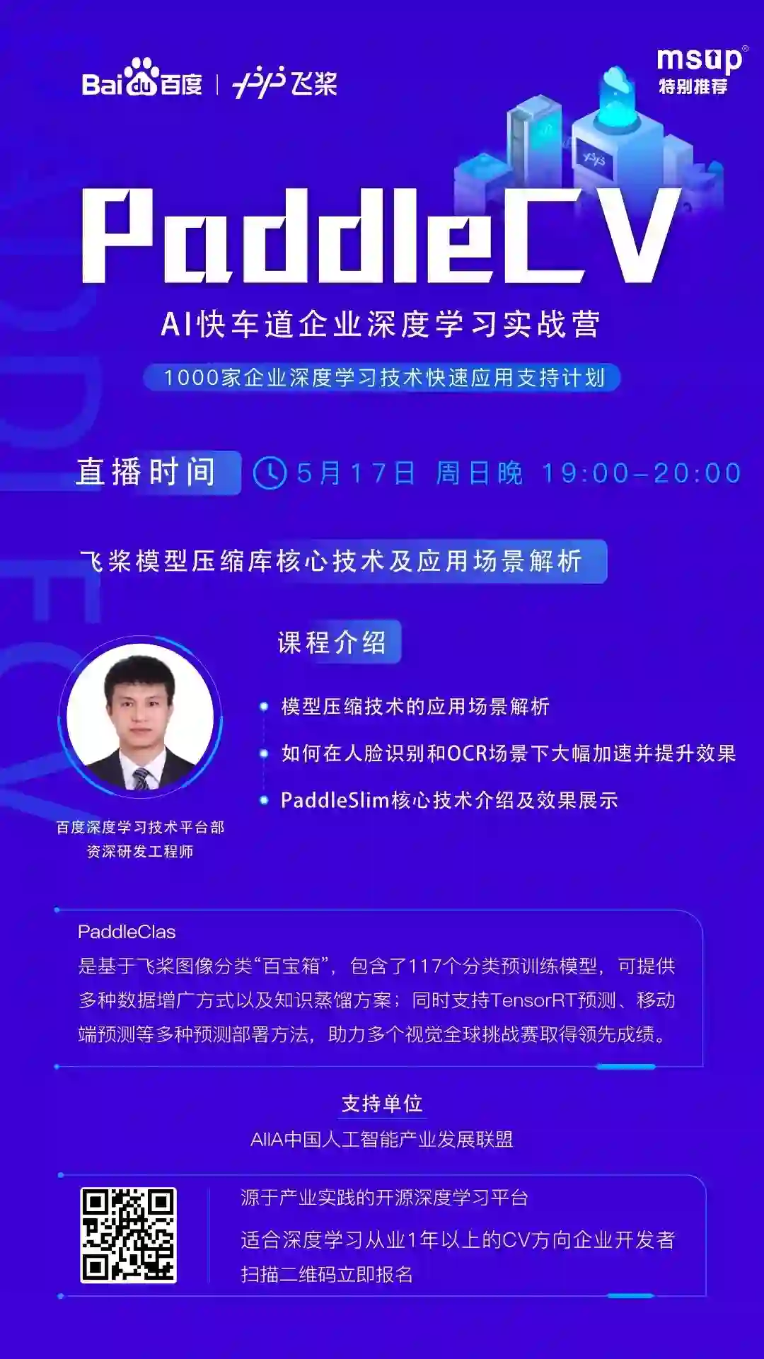 为模型瘦身,飞桨PaddleSlim提供了从剪枝、量化到轻量级神经网络架构搜索与自动模型压缩等一系列高效工具。5月17日19:00,百度资深研发工程师将在线解析飞桨模型压缩库核心技术及应用场景,欢迎扫码报名。