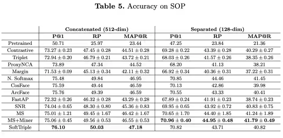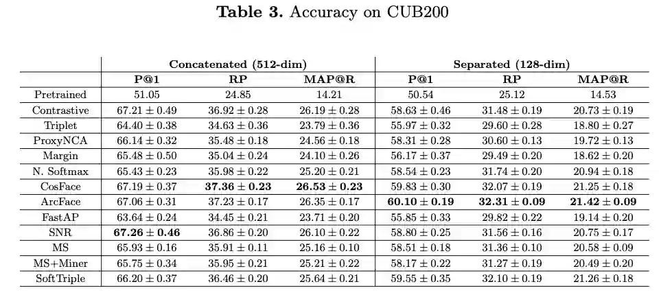 研究者选用了 3 个度量学习领域广泛使用的数据集:CUB200、Cars196 和 Stanford Online Products (SOP),选择这 3 个数据集也便于和之前的论文做比较。表 3-5 展示了训练运行的平均准确率,以及在适用时 95% 的置信区间,加粗部分代表了最好的平均准确率。同时也包括了预训练模型的准确率,用 PCA 将模型的嵌入值减少到 512 或 128。