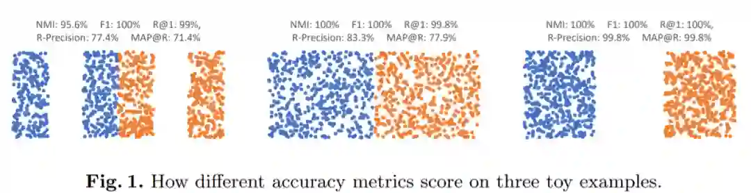 为了报告准确率,大多数度量学习论文用到的指标是 Recall@K、标准化互信息(NMI)以及 F1 分值。但这些真的是最佳度量标准吗?图 1 展示了三种嵌入空间,虽然它们有不同的特性,但每个 Recall@1 的分值都接近 100%,说明这个指标基本上提供不了什么信息。