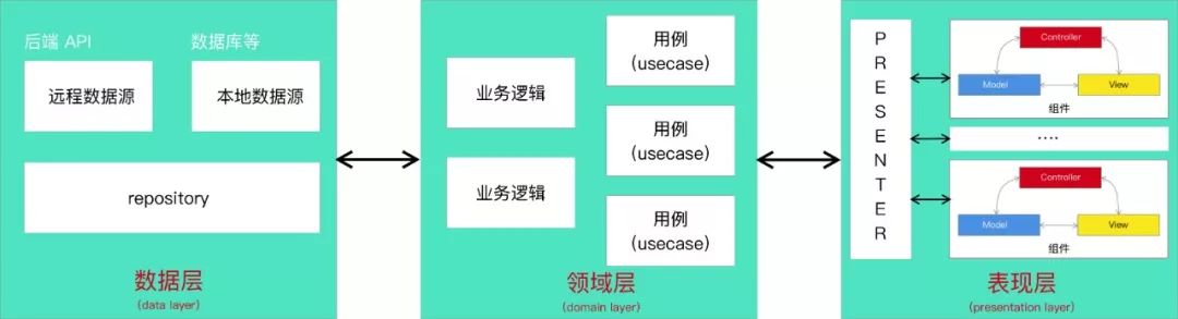 对于前端架构来说,Clean Architecure 实际上是:Clean Architecture + MVP + 组件化。如下图所示: