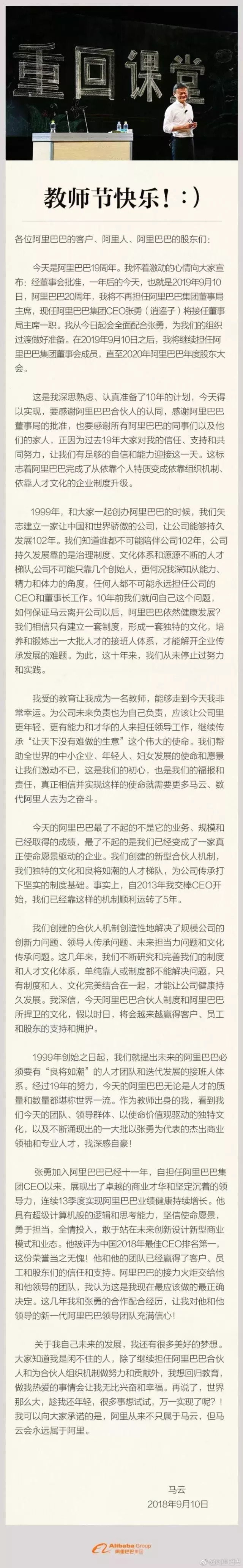 马云老师在公开信中宣布,在阿里巴巴20周年(即2019年9月10日)之际,将不再担任阿里巴巴集团董事局主席,现任阿里巴巴集团CEO张勇将接任董事局主席一职。