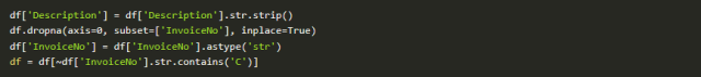 我们需要做一点数据处理。首先,一些数据描述中具有需要删除的空格。我们还会删除没有发票编号的行,并删除信用交易(发票编号包含C)。