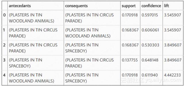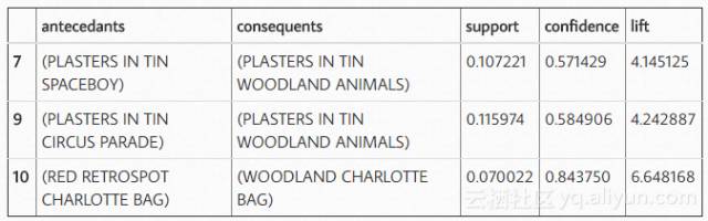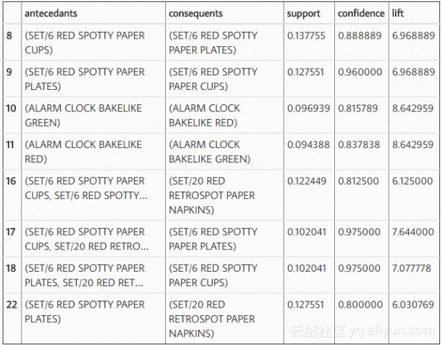 在查看规则时,可以发现似乎绿色和红色闹钟是一起购买的,红纸杯,餐巾纸和纸板是以总体概率提高的方式一起购买的。