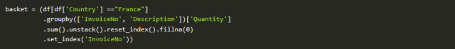 数据清理完成后,我们需要将每个产品进行one-hot编码。为了保持数据集小,我选择只是看法国的销售记录。然而,在下面的其他代码中,我将这些结果与德国的销售进行比较。进一步的国家比较将会是有趣的调查。
