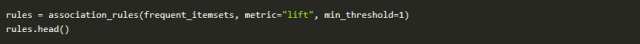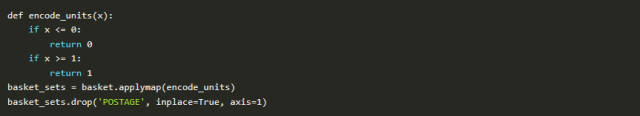 最后一个注意事项,与数据有关。此分析要求将交易的所有数据包含在1行中,并且编码方式应为one-hot编码(了解one-Hot编码)。了解MLxtend 的文档对了解如何运用是非常有用: