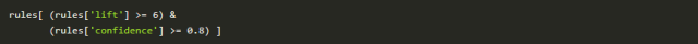 我们可以使用标准的pandas code来过滤数据帧。在这种情况下,寻找一个lift(6)和高信度(.8):