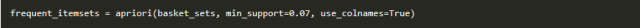 既然数据的结构是正确,我们可以生成支持至少7%的频繁项目集(选择这个数字,可以帮助我得到更多有用的例子。)