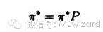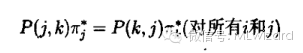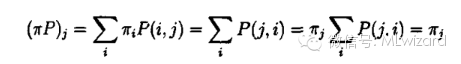 实际上,经过一个充分长的时间,期望的天气与初始状态无关,达到马氏链平衡状态,这儿的概率值与初始值是独立的。一个马氏链可能达到一个平稳分布,这儿作为某个特别给定状态的概率向量是与初始值无关的,平稳分布就是满足下式的分布: