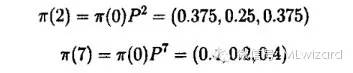 如果假设今天是雨,即π(0) = (1,0,0),则有π(2) = (0.4375,0.1875,0.75)和π(0) = (0.4,0.2,0.4)