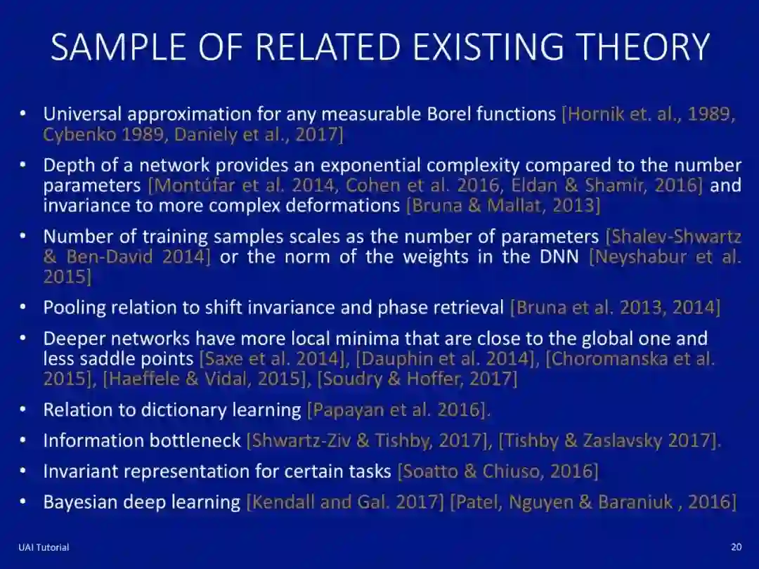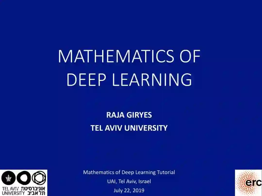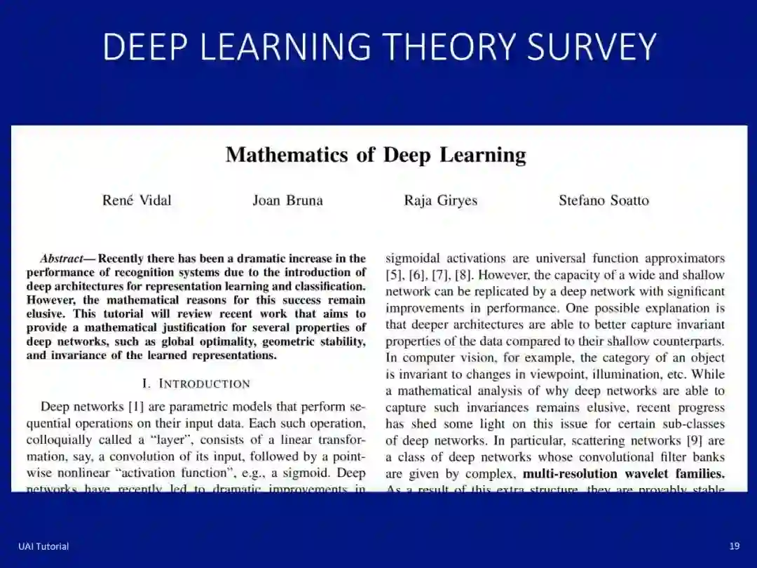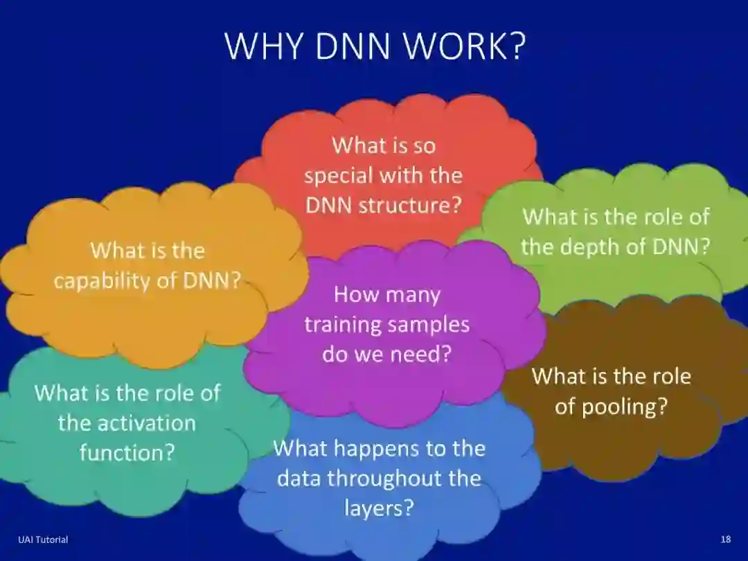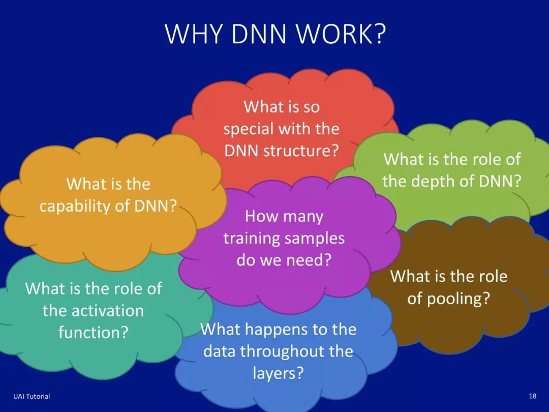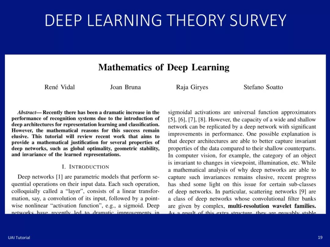 在人工智能不确定性会议(UAI)2019中,特拉维夫大学的教程《MATHEMATICS OF DEEP LEARNING》(《深度学习数学基础》)介绍了与深度学习相关的一些数学基础。该PPT首先介绍了目前一些成功的基于深度学习的应用,如疾病诊断、自动翻译、视频分类、图像降噪等。但作者认为,目前数学理论并不能很好地解释为什么深度学习可以达到如此好的效果。一些数学理论尝试解释深度网络的工作原理,例如深度网络需要多少训练数据、池化层的作用是什么、网络深度的作用等。后面,作者着重介绍了泛化误差、对抗攻击、输入边界、数据和模型的不变性等理论。