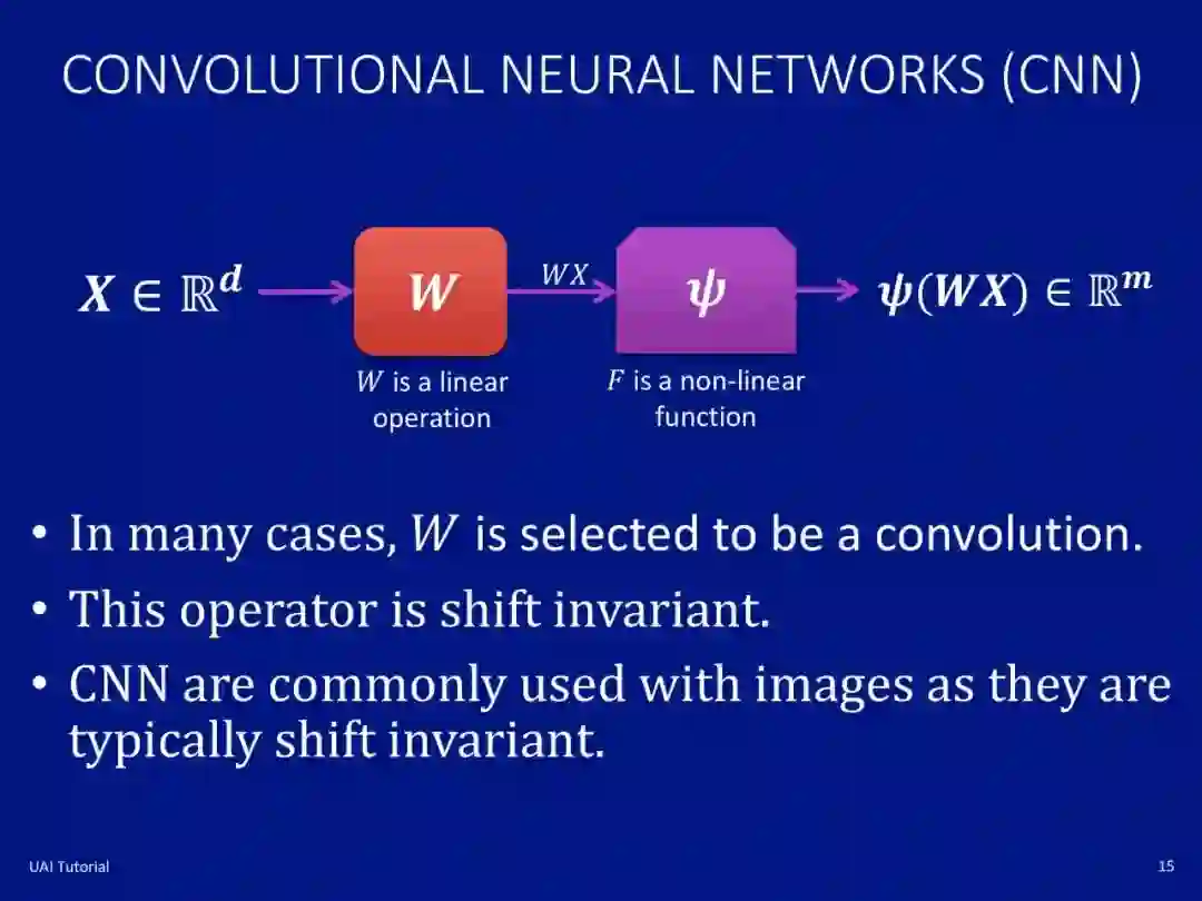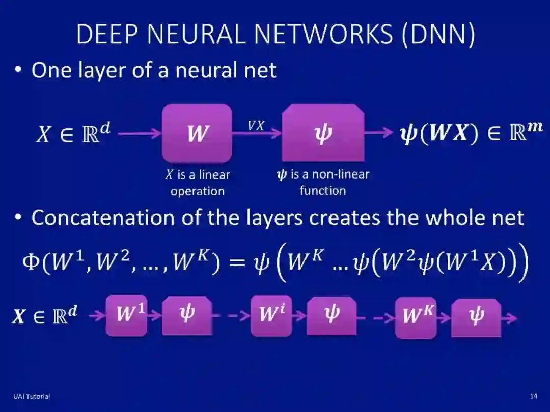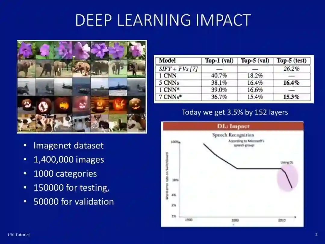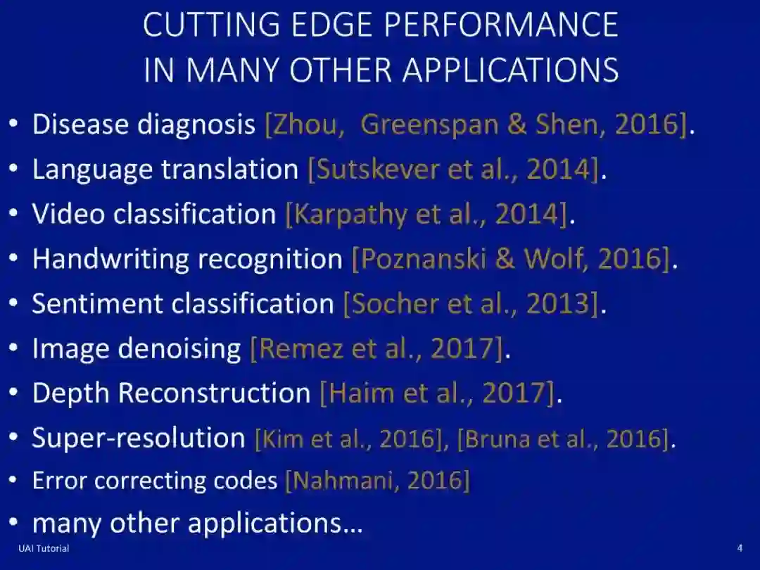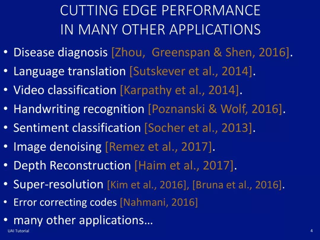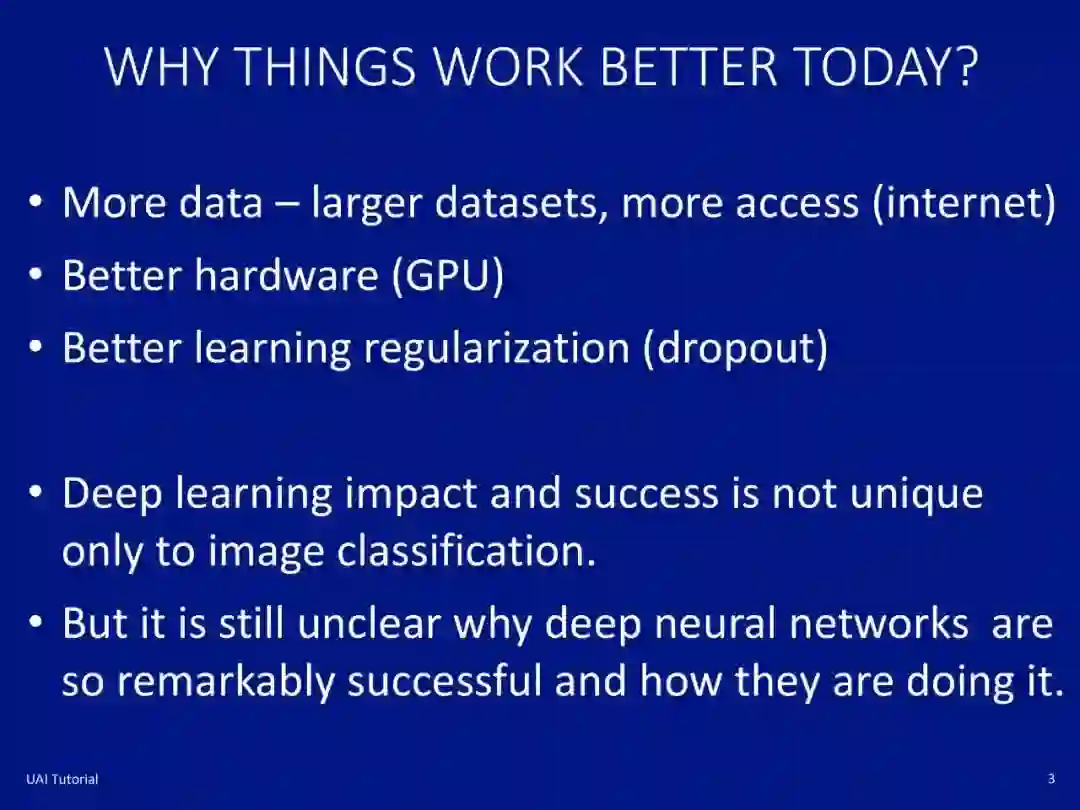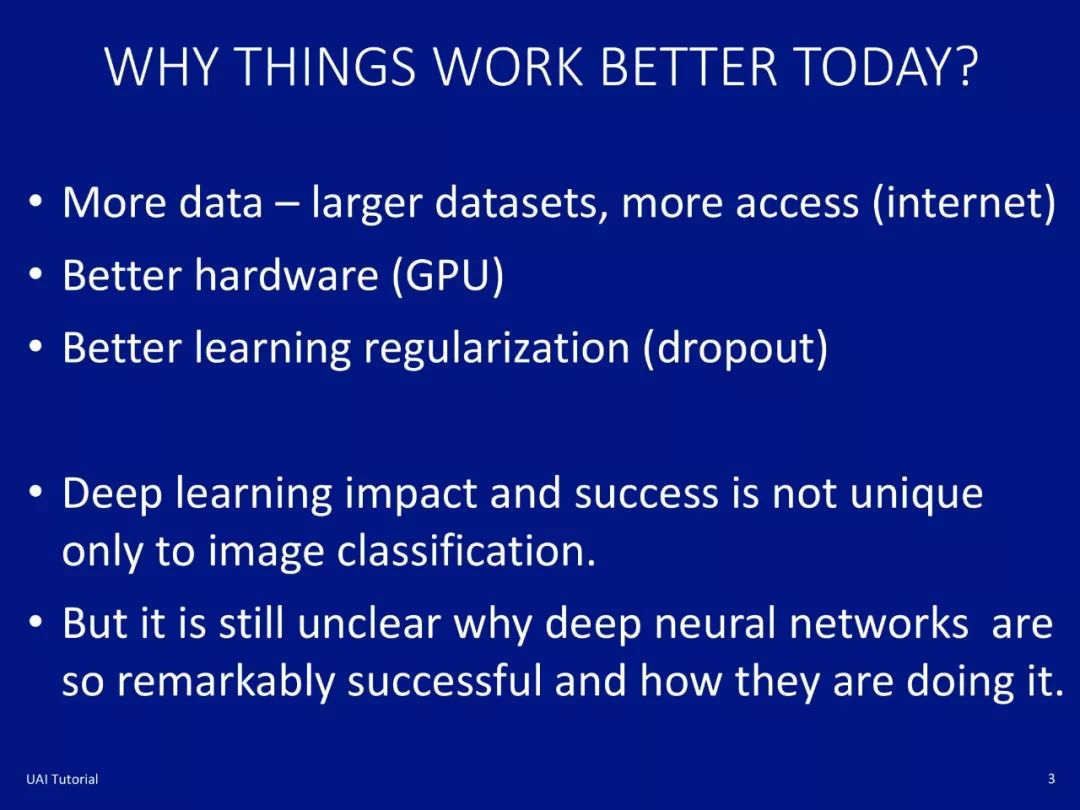 在人工智能不确定性会议(UAI)2019中,特拉维夫大学的教程《MATHEMATICS OF DEEP LEARNING》(《深度学习数学基础》)介绍了与深度学习相关的一些数学基础。该PPT首先介绍了目前一些成功的基于深度学习的应用,如疾病诊断、自动翻译、视频分类、图像降噪等。但作者认为,目前数学理论并不能很好地解释为什么深度学习可以达到如此好的效果。一些数学理论尝试解释深度网络的工作原理,例如深度网络需要多少训练数据、池化层的作用是什么、网络深度的作用等。后面,作者着重介绍了泛化误差、对抗攻击、输入边界、数据和模型的不变性等理论。