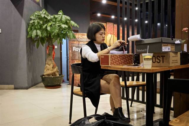 晚上九点多,阿冒带领我前往安福市场。一起吃夜宵的大排档距离安福大约两公里,他告诉我一定要步行过去,不要打车,因为“那边实在太堵”。如他所言,走了五六分钟,几十辆摩托车从身边驶过,后座上都放着一米多高的牛皮纸箱。阿冒说都是刚从安福提完货的,纸箱里都是假鞋。