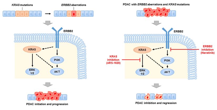 博士研究生李张在研究员王跃祥的指导下,系统分析了PDAC基因组测序数据,发现约8.5%的PDAC含有ERBB2的基因组变化,包括基因突变和基因扩增。ERBB2基因改变频率位于100个酪氨酸激酶基因的首位。有趣的是,含有ERBB2基因改变的PDAC同时含有KRAS突变,并且ERBB2基因改变与PDAC病人的不良预后相关。研究团队利用一系列体外、体内PDAC模型证明了PDAC中ERBB2基因改变具有致癌性,加速了PDAC恶性进展,降低了癌细胞对KRAS的依赖性。研究团队利用人源肿瘤异种移植小鼠模型,证明联合应用ERBB2抑制剂和KRAS抑制剂显著抑制人源PDAC的生长,为靶向ERBB2的药物用于胰腺癌病人的治疗提供了实验依据。