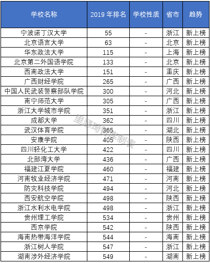 除以上四类学校之外,另有24所新进高校,其中表现最为亮眼的非宁波诺丁汉大学莫属。宁波诺丁汉大学于2005年才被教育部正式批准设立,距今只有14年办学时间,此次新入榜单便高居全国百强,位列第55位;除宁波诺丁汉大学之外,北京语言大学也是新进高校,同时也进入全国百强,位列第63位。