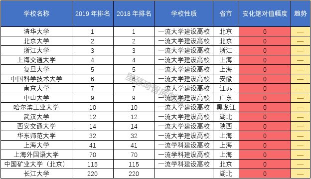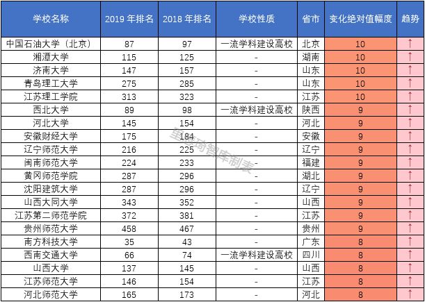 在今年榜单的前20位高校中,排名上升的高校有4所,排名下降的高校有5所,排名持平的高校有11所,在学校稳定性上顶尖高校表现最好。