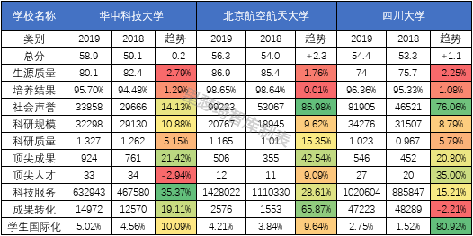 是什么指标在推动这些大学在软科排行榜上变动?我们不妨来简单看下各所学校的指标变动情况。