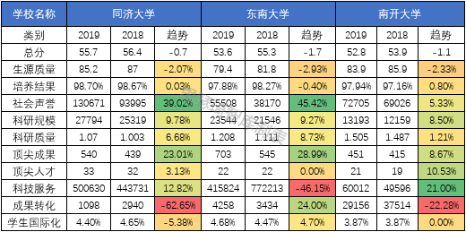 此外,同济大学和南开大学的成果转化(技术转让收入·千元)以及东南大学的科技服务(企业科研经费·千元)这两个指标的下降幅度非常明显,这是三所学校排名下降的个性原因。