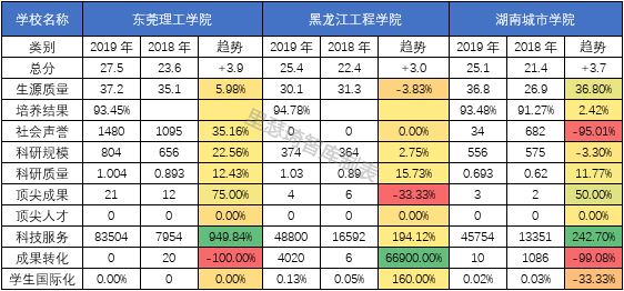 无独有偶,和排名上升的顶尖大学呈现一样的规律,排名上升幅度最大的三所大学也在科技服务(企业科研经费·千元)这一指标上有较为明显的上浮。