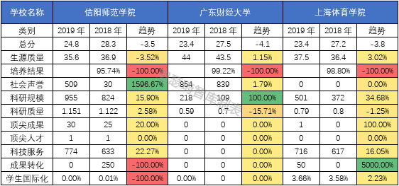 拿上海体育学院为例,其除了培养结果这一指标外其余指标相对去年都是上升或者持平,但是总分却少了将近4分,这和缺失的培养结果数据必然有直接的联系。