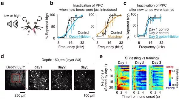 图注:a, 听觉二选一抉择任务。b, 后顶叶皮层失活影响对新声音刺激的抉择。c, 后顶叶皮层失活不影响对已学会声音刺激的抉择。d, 对同一群神经元进行长时程钙成像记录。e, 同一视野中所有神经元对训练(熟悉)和测试(陌生)声音刺激之间的选择性。选择性指数(selectivity index, SI)基于ROC分析,SI > 0 表示偏好测试声音刺激,SI < 0 表示偏好训练声音刺激。