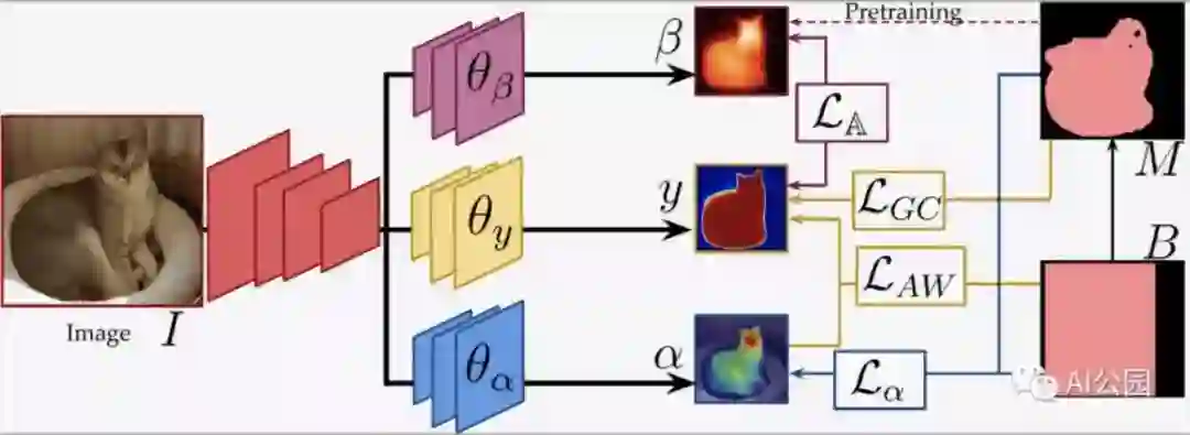 我们的方法是将边界框视为噪声标签。我们把框里的每个像素当作我们要寻找的边界的对象的一部分,然而,其中一些像素被错误地标记了。框外的所有像素都被正确标记为背景像素。在训练过程中,我们系统的输入通过三个卷积神经网络:一个目标分割网络和两个辅助网络。在运行过程中,我们丢弃了辅助网络,这样它们就不会增加已部署系统的复杂性。