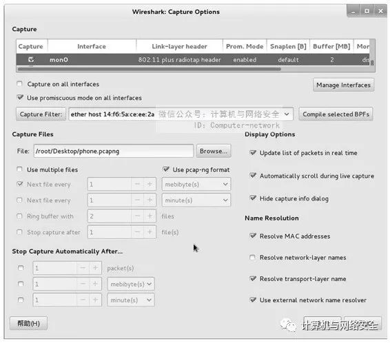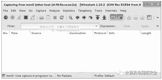 下面以Mac地址为14:f6:5a:ce:ee:2a的手机客户端为例,查看是否有流量产生。这里首先捕获该客户端的数据包,为了避免捕获到太多无用的数据包,使用捕获过滤器指定仅捕获Mac地址为14:f6:5a:ce:ee:2a客户端的数据包,如图20所示。