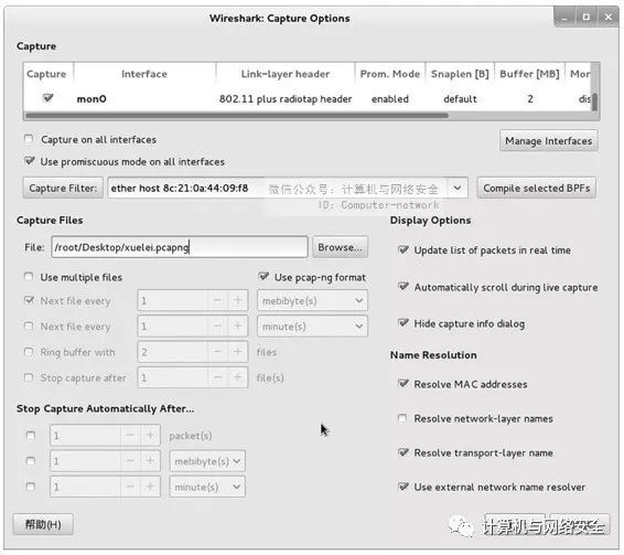 在该界面选择捕获接口、设置捕获文件及捕获过滤器。以上都配置完后,单击Start按钮开始捕获数据包,如图21所示。