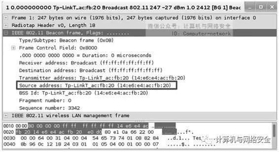 下面同样以802.11beacon.pcapng捕获文件为例,分析AP的Mac地址。这里选择查看该包中第一个AP的Mac地址,如图4所示。
