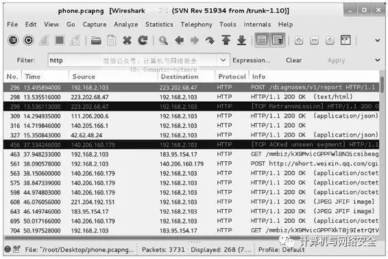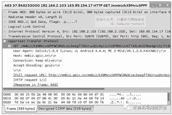 在该界面显示了客户端连接到WiFi网络的相关数据包。通常人们在手机上安装的一些使用流量的软件有QQ、微信和播放器等。这些软件都是应用类的软件,如果启动的话,会连接对应的服务器。这时候可以使用http显示过滤器,过滤并分析相关的包,如图23所示。