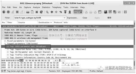 从该界面显示的包的详细信息中,可以看到当前该AP的SSID值为Broadcast,这表明该AP的SSID是隐藏的。