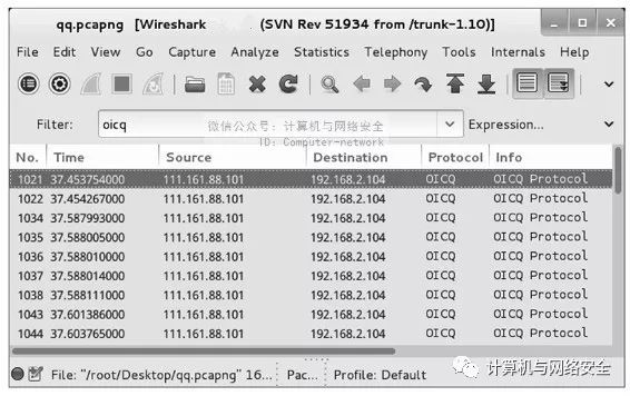 该界面显示了qq.pcapng捕获文件。由于QQ通信使用的是OICQ协议,可以使用OICQ显示过滤器来过滤器所有的OICQ包。qq.pcapng捕获文件过滤后,显示结果如图16所示。