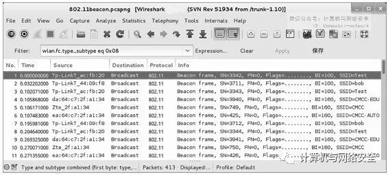 SSID名称就是AP的唯一标识符。如果要对一个AP实施渗透,首先要确定渗透的目标,也就是找到对应的SSID名称。但是,有时候搜索到的AP可能隐藏SSID了。所以,需要确定哪些AP的SSID名称是被隐藏的,哪些是显示的。下面介绍使用Wireshark查找AP的SSID名称的包。