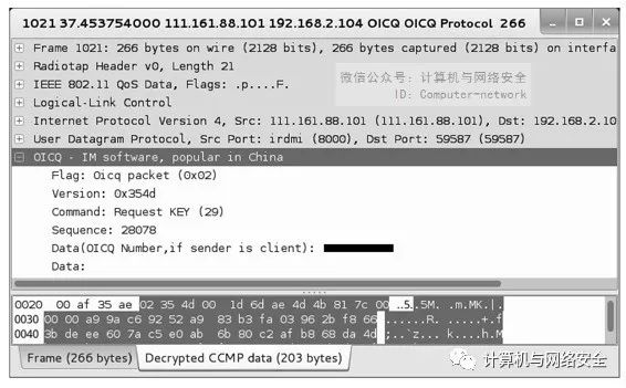 在界面显示了第一个包的详细信息。在该包的详细信息中,OICQ-IM software,popular in China行的展开内容中包括了OICQ的相关信息。如该包的标志、版本、执行的命令及QQ号等。在图17中,隐藏的部分就是显示QQ号码的位置。以上执行的命令是Request KEY(29),表示客户端登录过程中的密码验证。