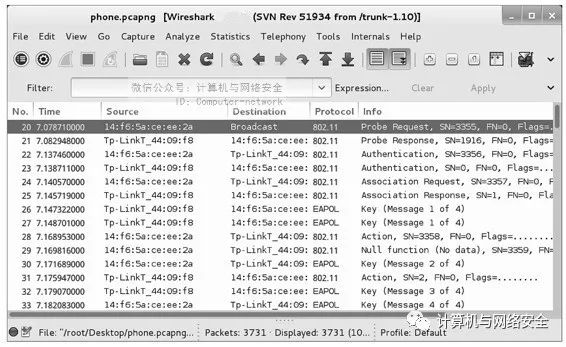 为了更清楚地理解客户端接入AP的过程,这里捕获了一个名为Probe.pcapng的捕获文件。在捕获文件中捕获到一个客户端连接AP的过程,其接入过程如图9所示。