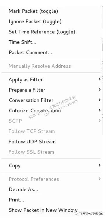 前面提到QQ传输的数据都是加密的,这里来确认下是否真的是加密的。如查看qq.pcapng捕获文件中的一个QQ会话内容。在图16中选择第一个包(1021帧),然后单击右键,将弹出如图18所示的界面。
