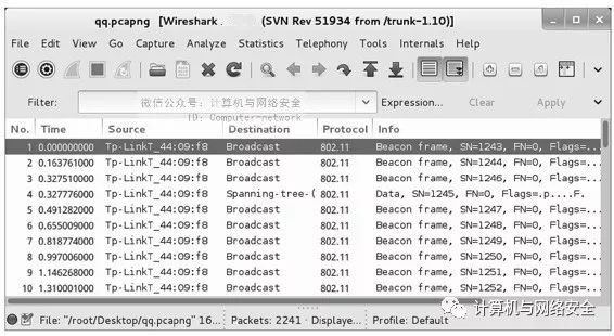 捕获一个名为802.11beacon.pcapng的包,在该包中包括当前无线网卡搜索到的无线数据包,其内容如图1所示。
