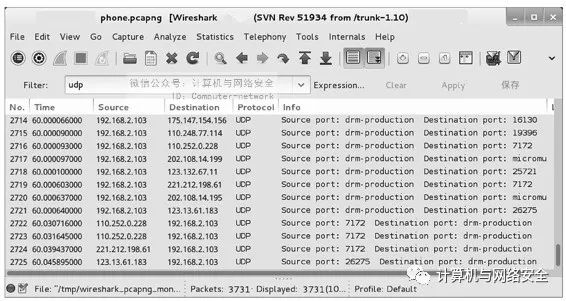 如果客户端有播放器产生流量的话,将会捕获到大量的UDP协议包。可以使用UDP显示过滤器过滤,显示结果如图26所示。